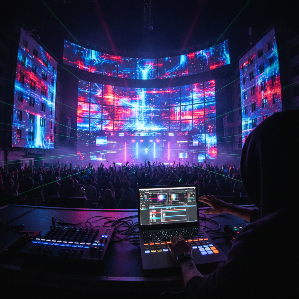Création visuelle immersive et gestion temps réel : VJing, mapping, scénographie et murs LED. Un show synchronisé, artistique & technique.